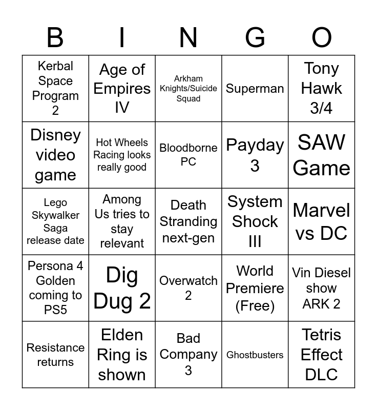 This bingo card has 25 words: Dig Dug 2, Bad Company 3, Bloodborne PC, Resistance returns, Tony Hawk 3/4, Kerbal Space Program 2, Disney video game, Age of Empires IV, System Shock III, Overwatch 2, Payday 3, Lego Skywalker Saga release date, World Premiere (Free), Vin Diesel show ARK 2, Hot Wheels Racing looks really good, Tetris Effect DLC, Marvel vs DC, Arkham Knights/Suicide Squad, SAW Game, Among Us tries to stay relevant, Death Stranding next-gen, Elden Ring is shown, Persona 4 Golden coming to PS5, Superman and Ghostbusters.