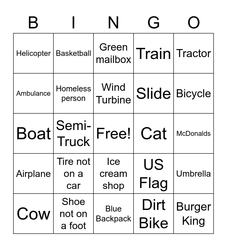 This bingo card has a free space and 29 words: Cow, Motorcycle, Semi-Truck, Dog (not Mo), Helicopter, Green mailbox, Homeless person, Tire not on a car, Cat, Shoe not on a foot, McDonalds, Burger King, Blue Backpack, Dirt Bike, Bicycle, Coffee Shop, Ice cream shop, Airplane, Tractor, Boat, US Flag, The word "welcome", Slide, Ambulance, Train, Basketball, Umbrella, Wind Turbine and Soccer Ball.