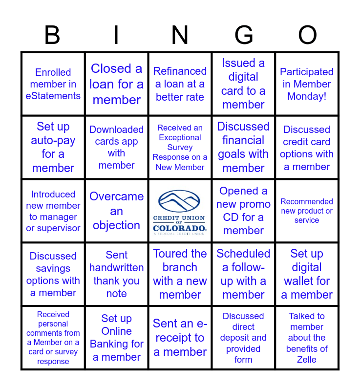 This bingo card has a free space and 24 words: Sent handwritten thank you note, Set up Online Banking for a member, Received an Exceptional Survey Response on a New Member, Received personal comments from a Member on a card or survey response, Participated in Member Monday!, Enrolled member in eStatements, Set up auto-pay for a member, Closed a loan for a member, Opened a new promo CD for a member, Toured the branch with a new member, Discussed financial goals with member, Introduced new member to manager or supervisor, Scheduled a follow-up with a member, Set up digital wallet for a member, Downloaded cards app with member, Discussed direct deposit and provided form, Recommended new product or service, Refinanced a loan at a better rate, Discussed credit card options with a member, Overcame an objection, Talked to member about the benefits of Zelle, Discussed savings options with a member, Issued a digital card to a member and Sent an e-receipt to a member.