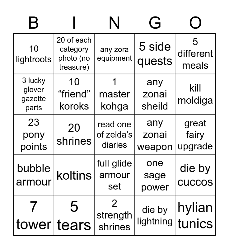 This bingo card has 25 words: koltins, 2 strength shrines, 1 master kohga, 7 tower, 5 different meals, 10 lightroots, 3 lucky glover gazette parts, 20 of each category photo (no treasure), any zonai weapon, full glide armour set, any zonai sheild, 23 pony points, one sage power, die by cuccos, 10 “friend” koroks, hylian tunics, great fairy upgrade, any zora equipment, kill moldiga, 20 shrines, read one of zelda’s diaries, 5 tears, bubble armour, 5 side quests and die by lightning.