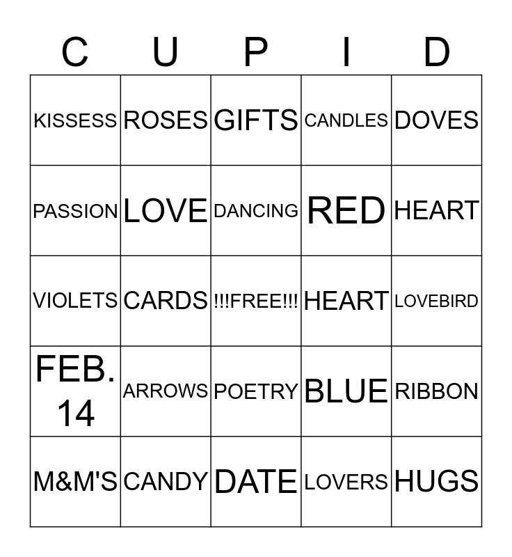 This bingo card has a free space and 24 words: ARROWS, CANDY, DANCING, M&M'S, DOVES, KISSESS, PASSION, ROSES, HEART, POETRY, RED, VIOLETS, BLUE, RIBBON, LOVE, LOVERS, LOVEBIRD, GIFTS, HEART, CARDS, HUGS, FEB. 14, CANDLES and DATE.