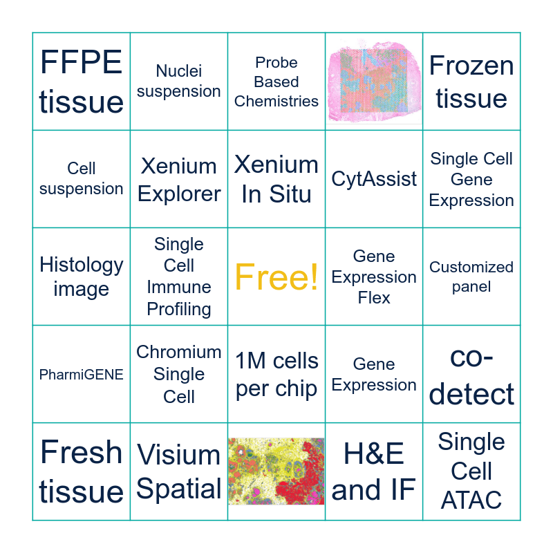 This bingo card has 2 images, a free space and 22 words: Chromium Single Cell, Visium Spatial, Xenium In Situ, Fresh tissue, Frozen tissue, FFPE tissue, Cell suspension, Nuclei suspension, Gene Expression Flex, 1M cells per chip, CytAssist, Histology image, Gene Expression, co-detect, Xenium Explorer, H&E and IF, Customized panel, Probe Based Chemistries, Single Cell Gene Expression, Single Cell Immune Profiling, Single Cell ATAC and PharmiGENE.