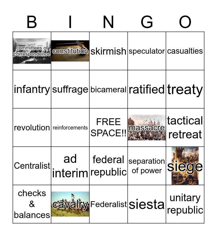 This bingo card has 5 images, a free space and 24 words: ad interim, cavalry, bicameral, checks & balances, casualties, committees of correspondence, infantry, constitution, massacre, federal republic, ratified, revolution, separation of power, siege, suffrage, siesta, tactical retreat, skirmish, treaty, reinforcements, unitary republic, Centralist, speculator and Federalist.