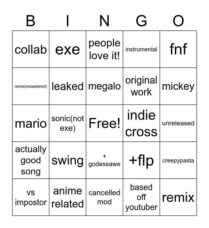 This bingo card has a free space and 24 words: swing, anime related, megalo, vs impostor, fnf, collab, remix(resastered), exe, indie cross, + godessawe, original work, mario, +flp, creepypasta, leaked, based off youtuber, unreleased, people love it!, mickey, sonic(not exe), remix, actually good song, instrumental and cancelled mod.