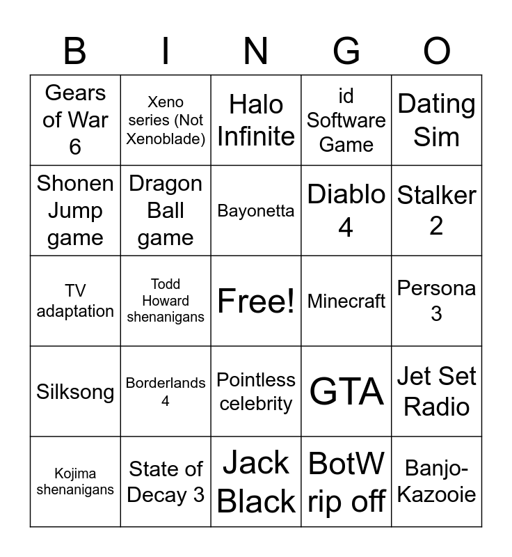 This bingo card has a free space and 24 words: Borderlands 4, State of Decay 3, Bayonetta, Kojima shenanigans, Dating Sim, Gears of War 6, Shonen Jump game, Xeno series (Not Xenoblade), Minecraft, Pointless celebrity, Diablo 4, TV adaptation, GTA, Jet Set Radio, Dragon Ball game, BotW rip off, Persona 3, Halo Infinite, Stalker 2, Todd Howard shenanigans, Banjo-Kazooie, Silksong, id Software Game and Jack Black.