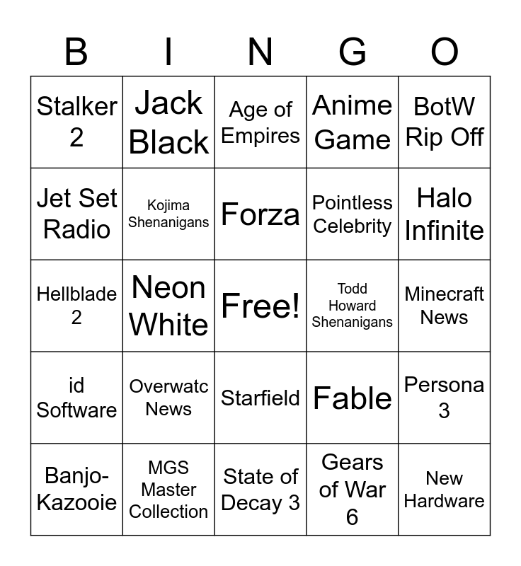 This bingo card has a free space and 24 words: Overwatc News, MGS Master Collection, Forza, Banjo-Kazooie, BotW Rip Off, Stalker 2, Jet Set Radio, Jack Black, Todd Howard Shenanigans, Starfield, Pointless Celebrity, Hellblade 2, Fable, Persona 3, Kojima Shenanigans, Gears of War 6, Minecraft News, Age of Empires, Halo Infinite, Neon White, New Hardware, id Software, Anime Game and State of Decay 3.