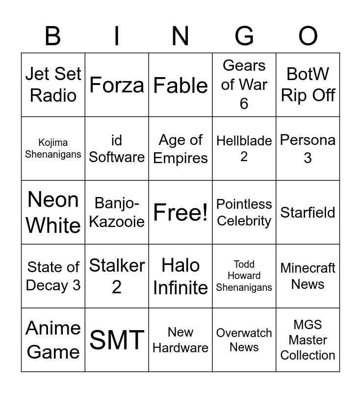 This bingo card has a free space and 24 words: Stalker 2, SMT, Age of Empires, Anime Game, BotW Rip Off, Jet Set Radio, Kojima Shenanigans, Forza, Pointless Celebrity, Halo Infinite, Hellblade 2, Neon White, Todd Howard Shenanigans, Minecraft News, id Software, Overwatch News, Starfield, Fable, Persona 3, Banjo-Kazooie, MGS Master Collection, State of Decay 3, Gears of War 6 and New Hardware.