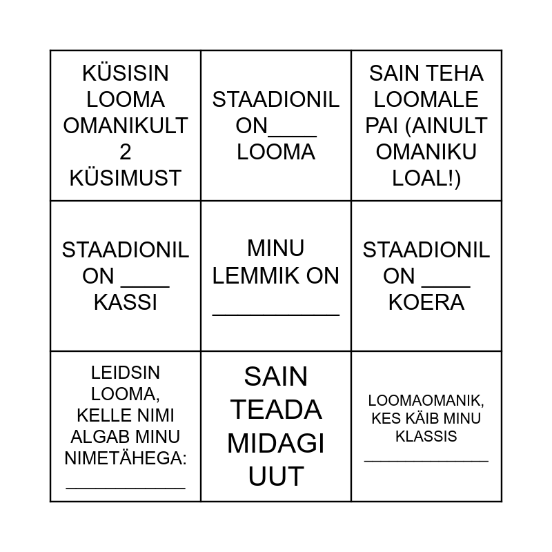 This bingo card has 9 words: LEIDSIN LOOMA, KELLE NIMI ALGAB MINU NIMETÄHEGA: ____________, MINU LEMMIK ON __________, SAIN TEHA LOOMALE PAI (AINULT OMANIKU LOAL!), KÜSISIN LOOMA OMANIKULT 2 KÜSIMUST, STAADIONIL ON____ LOOMA, STAADIONIL ON ____ KOERA, STAADIONIL ON ____ KASSI, SAIN TEADA MIDAGI UUT and LOOMAOMANIK, KES KÄIB MINU KLASSIS _______________.