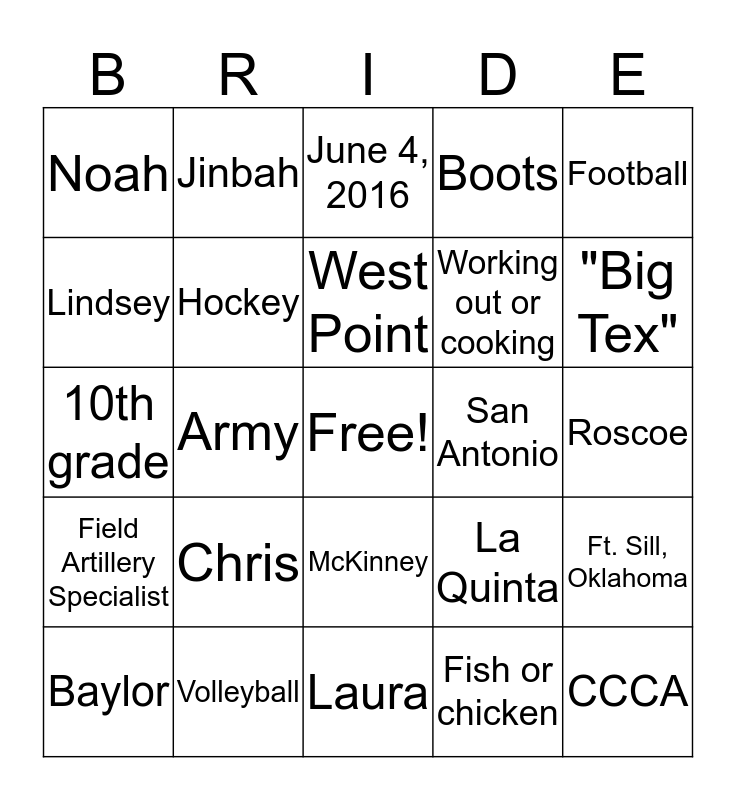 This bingo card has a free space and 24 words: Chris, Volleyball, West Point, Baylor, Football, Noah, Lindsey, Jinbah, San Antonio, McKinney, Working out or cooking, 10th grade, La Quinta, Ft. Sill, Oklahoma, Hockey, Fish or chicken, Roscoe, June 4, 2016, "Big Tex", Army, CCCA, Field Artillery Specialist, Boots and Laura.
