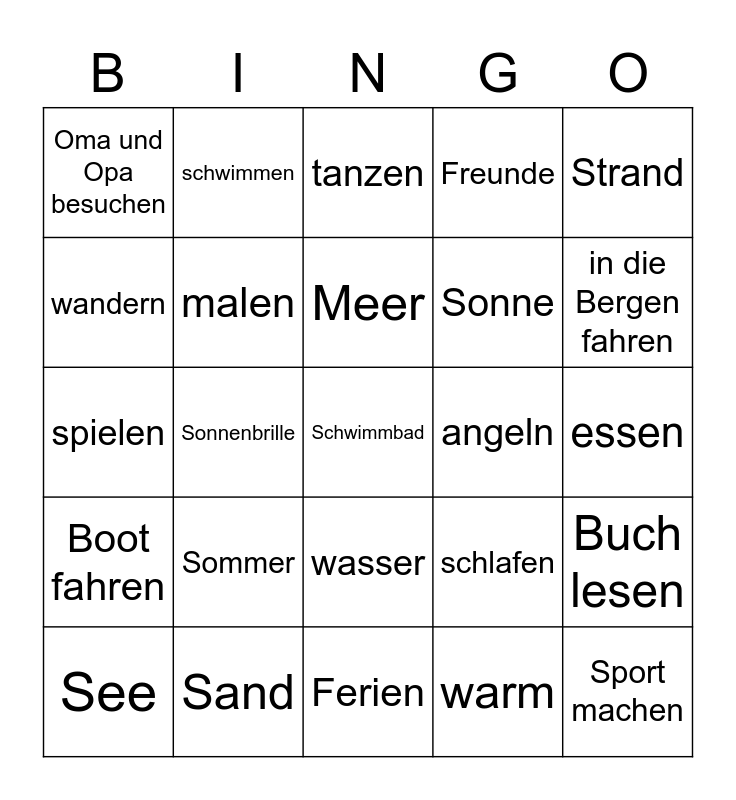 This bingo card has 25 words: Sommer, Ferien, Meer, See, Strand, Oma und Opa besuchen, wandern, schwimmen, angeln, wasser, Sonne, spielen, schlafen, Buch lesen, malen, Sport machen, essen, tanzen, in die Bergen fahren, Sonnenbrille, Schwimmbad, Sand, Boot fahren, Freunde and warm.