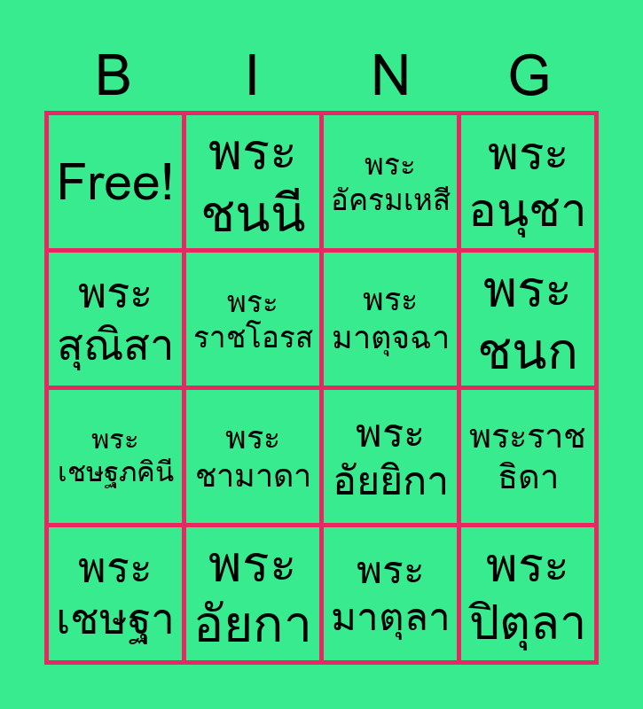 This bingo card has 16 words: พระเชษฐา, พระอัยกา, พระอัครมเหสี, พระอนุชา, พระสุณิสา, พระชนนี, พระอัยยิกา, พระราชธิดา, Free!, พระราชโอรส, พระมาตุลา, พระชนก, พระเชษฐภคินี, พระชามาดา, พระมาตุจฉา and พระปิตุลา.