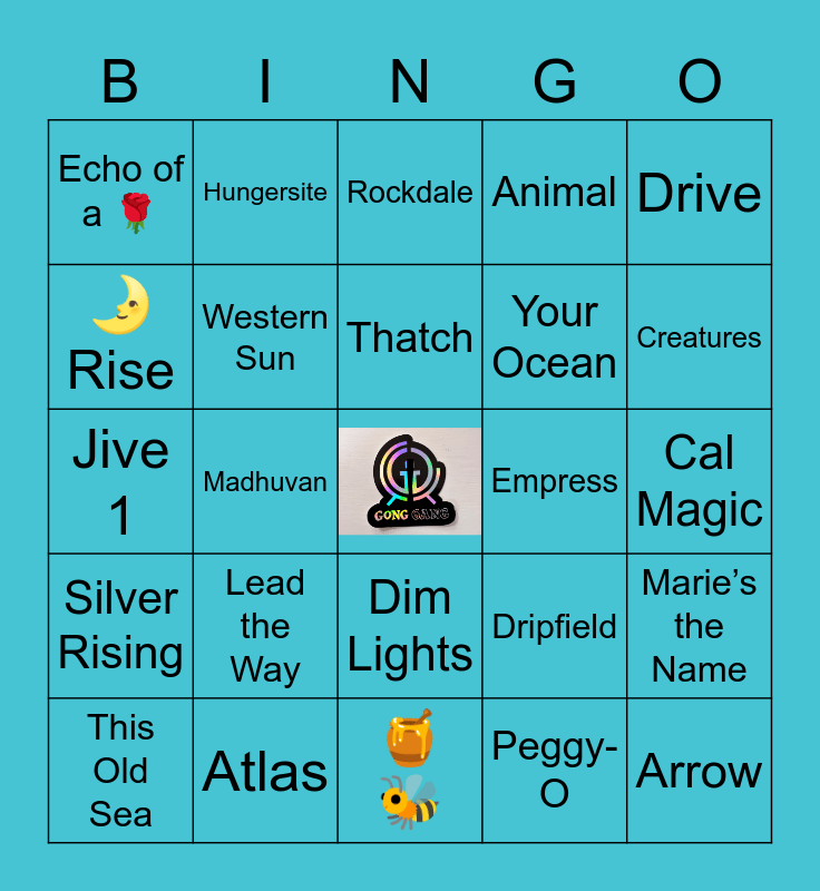 This bingo card has a free space and 24 words: Lead the Way, Atlas, Thatch, This Old Sea, Drive, Echo of a 🌹, 🌛Rise, Hungersite, Empress, Dim Lights, Your Ocean, Jive 1, Dripfield, Marie’s the Name, Western Sun, Peggy-O, Cal Magic, Rockdale, Creatures, Madhuvan, Arrow, Silver Rising, Animal and 🍯🐝.