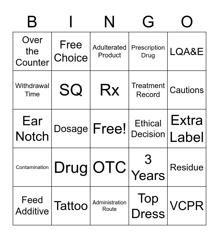 This bingo card has a free space and 32 words: Top Dress, FDA, Dosage, Medication, Contamination, SQ, LQA&E, Residue, Free Choice, Producer, Rx, Adulterated Product, Expiration Date, Active Ingredient, Ethical Decision, Medicated Feed, Feed Additive, Ear Notch, OTC, Drug, 3 Years, IM, Extra Label, Tattoo, VCPR, Prescription Drug, Treatment Record, Withdrawal Time, Over the Counter, Administration Route, Wholesome Food and Cautions.