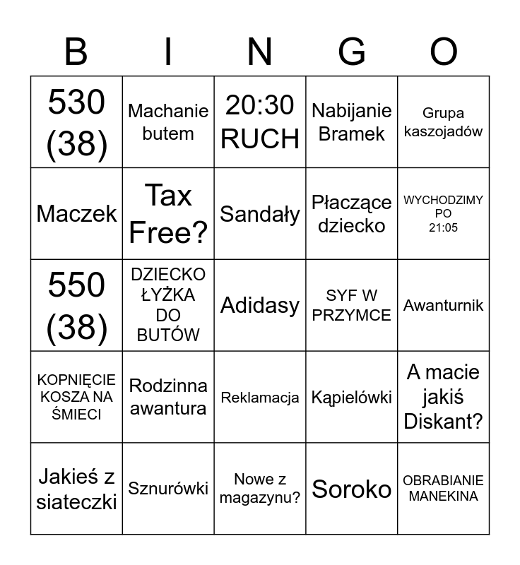 This bingo card has a free space and 24 words: Rodzinna awantura, Sznurówki, Sandały, Jakieś z siateczki, Grupa kaszojadów, 530 (38), Maczek, Machanie butem, SYF W PRZYMCE, Reklamacja, Płaczące dziecko, 550 (38), Kąpielówki, A macie jakiś Diskant?, Tax Free?, Soroko, Awanturnik, 20:30 RUCH, WYCHODZIMY PO 21:05, DZIECKO ŁYŻKA DO BUTÓW, OBRABIANIE MANEKINA, KOPNIĘCIE KOSZA NA ŚMIECI, Nabijanie Bramek and Nowe z magazynu?.
