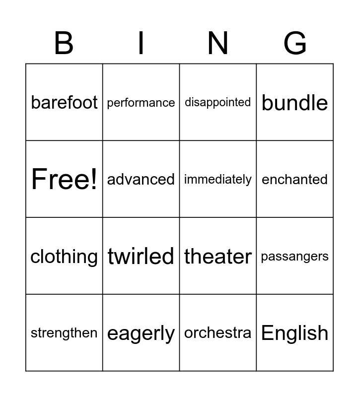 This bingo card has 16 words: eagerly, passangers, disappointed, barefoot, clothing, performance, theater, orchestra, Free!, advanced, strengthen, bundle, twirled, enchanted, immediately and English.