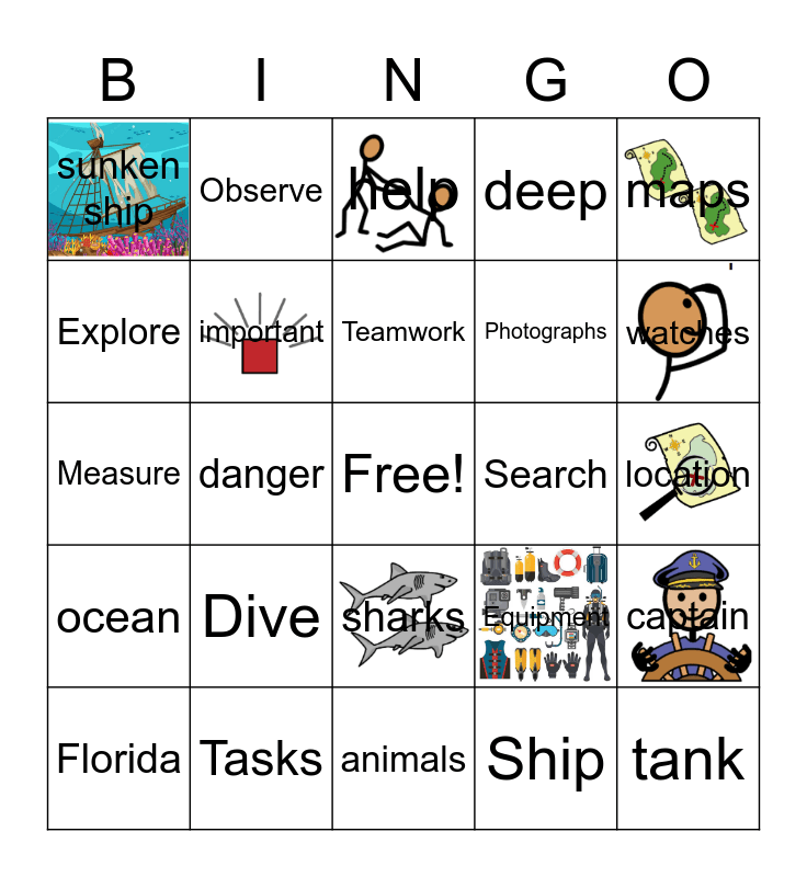 This bingo card has 9 images, a free space and 24 words: Dive, Tasks, Teamwork, Florida, maps, sunken ship, Explore, Observe, Search, sharks, Photographs, Measure, Equipment, captain, important, Ship, location, help, watches, danger, tank, ocean, deep and animals.