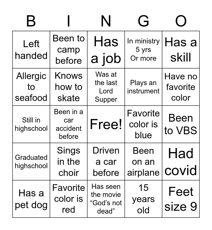 This bingo card has a free space and 24 words: Sings in the choir, Favorite color is red, Was at the last Lord Supper, Has a pet dog, Has a skill, Left handed, Allergic to seafood, Been to camp before, Favorite color is blue, Driven a car before, Plays an instrument, Still in highschool, Been on an airplane, Had covid, Knows how to skate, 15 years old, Been to VBS, Has a job, Have no favorite color, Been in a car accident before, Feet size 9, Graduated highschool, In ministry 5 yrs Or more and Has seen the movie “God’s not dead”.