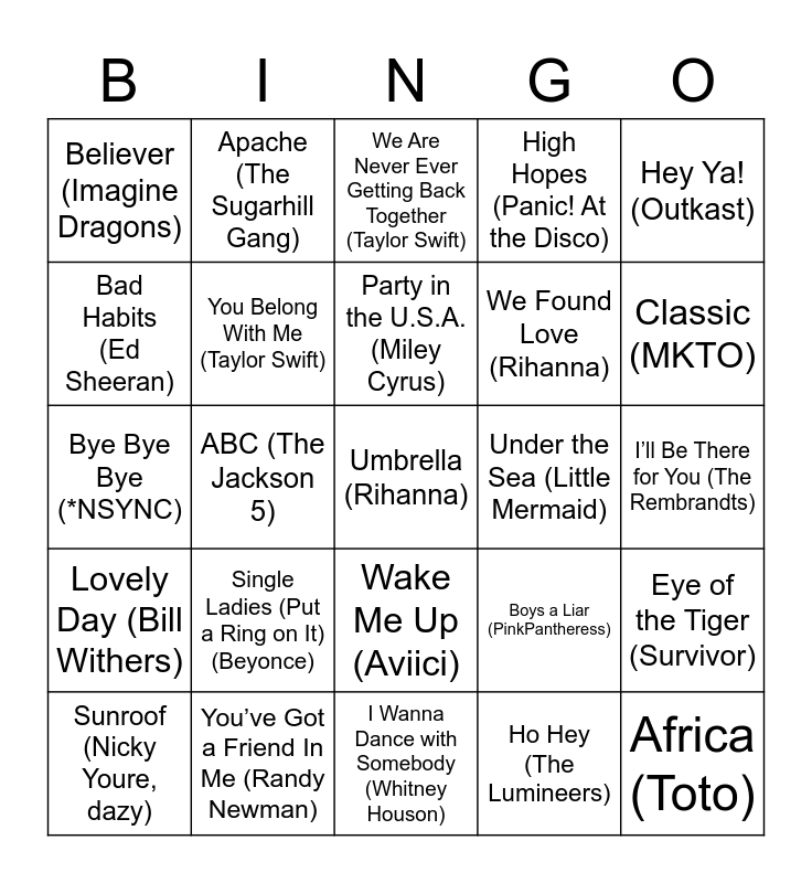This bingo card has 81 words: Free!, Levitating (Dua Lipa), We Are Never Ever Getting Back Together (Taylor Swift), Clarity (Zedd), Ironic (Alanis Morissette), As It Was (Harry Styles), good 4 u (Olivia Rodrigo), All Star (Smash Mouth), HandClap (Fitz and the Tantrums), Shut Up and Dance (WALK THE MOON), Ain’t No Mountain High Enough (Marvin Gaye), Sunflower (Post Malone), High Hopes (Panic! At the Disco), Believer (Imagine Dragons), Hooked on a Feeling (Blue Swede), Bad Habits (Ed Sheeran), Never Gonna Give You Up (Rick Astley), Single Ladies (Put a Ring on It) (Beyonce), Call Me Maybe (Carly Rae Jepsen), I’ll Be There for You (The Rembrandts), Since U Been Gone (Kelly Clarkson), Hey Ya! (Outkast), Bye Bye Bye (*NSYNC), Party in the U.S.A. (Miley Cyrus), You Belong With Me (Taylor Swift), Magic (B.o.B.), Bad guy (Billie Eilish), Firework (Katy Perry), Sorry (Justin Bieber), Blinding Lights (The Weeknd), Classic (MKTO), Don’t Stop The Music (Rihanna), I Wanna Dance with Somebody (Whitney Houson), Africa (Toto), Sunroof (Nicky Youre, dazy), Under the Sea (Little Mermaid), We’re All In This Together (High School Musical), Poker Face (Lady Gaga), Livin’ On A Prayer (Bon Jovi), Wannabe (Spice Girls), Umbrella (Rihanna), Radioactive (Imagine Dragons), Dancing Queen (ABBA), Walking on Sunshine (Katrina and the Waves), ABC (The Jackson 5), Karma (Taylor Swift), Apache (The Sugarhill Gang), Smells like Teen Spirit (Nirvana), Calm Down (Selena Gomez), Flowers (Miley Cyrus), Boys a Liar (PinkPantheress), Eye of the Tiger (Survivor), God’s Plan (Drake), What Makes You Beautiful (One Direction), Starships (Nicki Minaj), Mr. Brightside (The Killers), Viva La Vida (Coldplay), Hotline Bling (Drake), Thriller (Michael Jackson), I Ain’t Worried (OneRepublic), Wake Me Up (Aviici), Dynamite (Taio Cruz), Style (Taylor Swift), Havana (Camila Cabello), Year 3000 (Jonas Brothers), My Girl (The Temptations), Jessie’s Girl (Rick Springfield), Wonderwall (Oasis), Build Me Up Buttercup (The Foundations), September (Earth, Wind, and Fire), Dancing in the Moonlight (Toploader), Lovely Day (Bill Withers), You’ve Got a Friend In Me (Randy Newman), Valerie (Amy Whinehouse), Sweet Home Alabama (Lynyrd Skynyrd), Sk8er Boy (Avril Lavigne), All The Small Things (blink182), Ho Hey (The Lumineers), Surfin’ USA (The Beach Boys), We Found Love (Rihanna) and Respect (Aritha Franklin).
