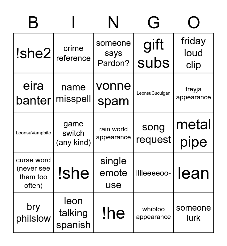 This bingo card has 25 words: !she, !he, vonne spam, bry philslow, friday loud clip, !she2, eira banter, crime reference, song request, single emote use, LeonsuCucuigan, LeonsuVampbite, lllleeeeoo-, lean, name misspell, someone lurk, metal pipe, someone says Pardon?, freyja appearance, game switch (any kind), rain world appearance, leon talking spanish, curse word (never see them too often), gift subs and whibloo appearance.