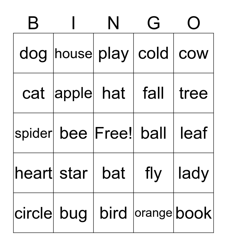 This bingo card has a free space and 24 words: star, bug, hat, circle, cow, dog, cat, house, ball, bat, fall, spider, fly, lady, apple, orange, leaf, play, tree, bee, book, heart, cold and bird.