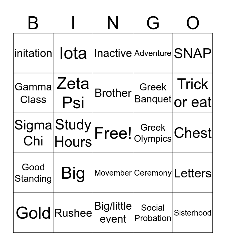 This bingo card has a free space and 24 words: Big, Rushee, Brother, Gold, SNAP, initation, Gamma Class, Iota, Greek Olympics, Movember, Greek Banquet, Sigma Chi, Ceremony, Letters, Zeta Psi, Social Probation, Chest, Inactive, Trick or eat, Study Hours, Sisterhood, Good Standing, Adventure and Big/little event.