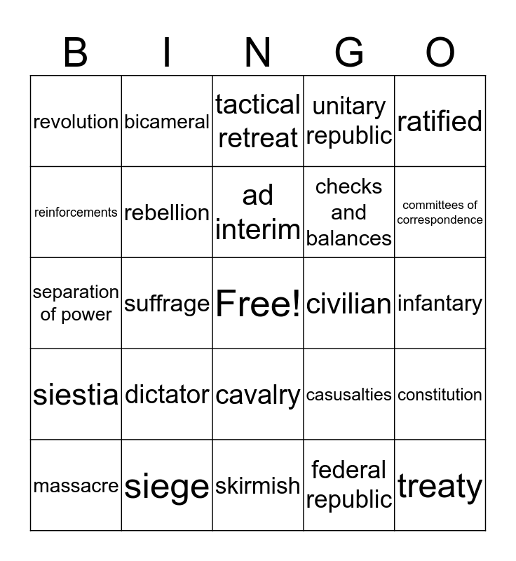 This bingo card has a free space and 24 words: dictator, siege, ad interim, massacre, ratified, revolution, reinforcements, bicameral, civilian, cavalry, checks and balances, separation of power, casusalties, constitution, rebellion, federal republic, infantary, tactical retreat, committees of correspondence, suffrage, treaty, siestia, unitary republic and skirmish.
