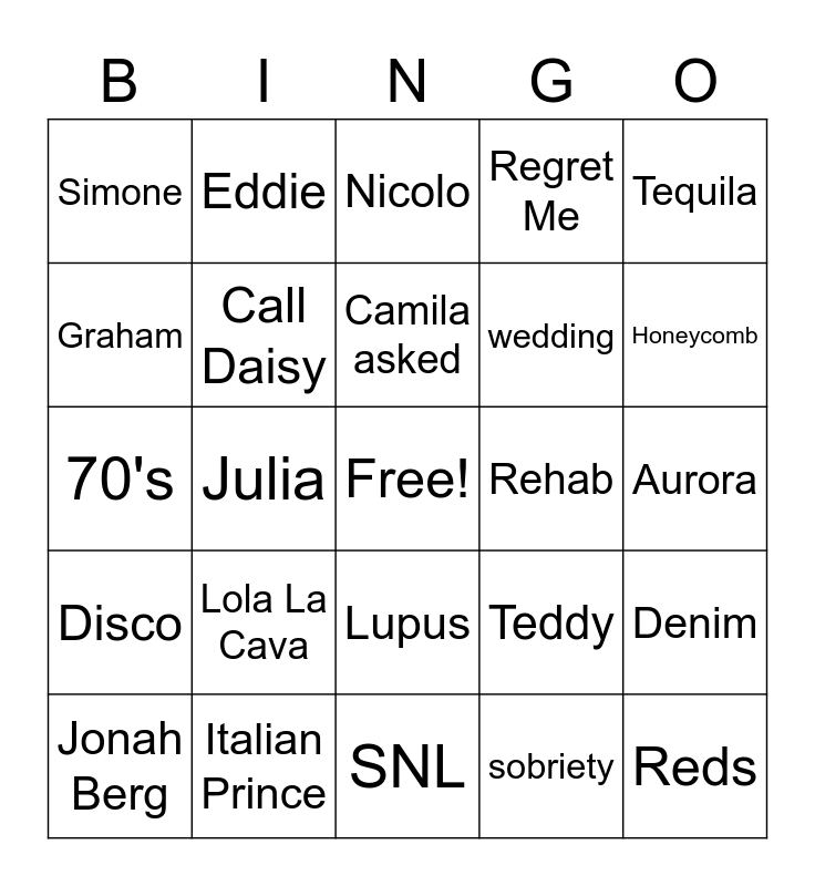 This bingo card has a free space and 25 words: Lola La Cava, SNL, Camila asked, Jonah Berg, Tequila, Simone, Graham, Eddie, Rehab, Lupus, wedding, 70's, Teddy, Denim, Call Daisy, Abortion, Aurora, Nicolo, Honeycomb, Julia, Reds, Italian Prince, Disco, Regret Me and sobriety.