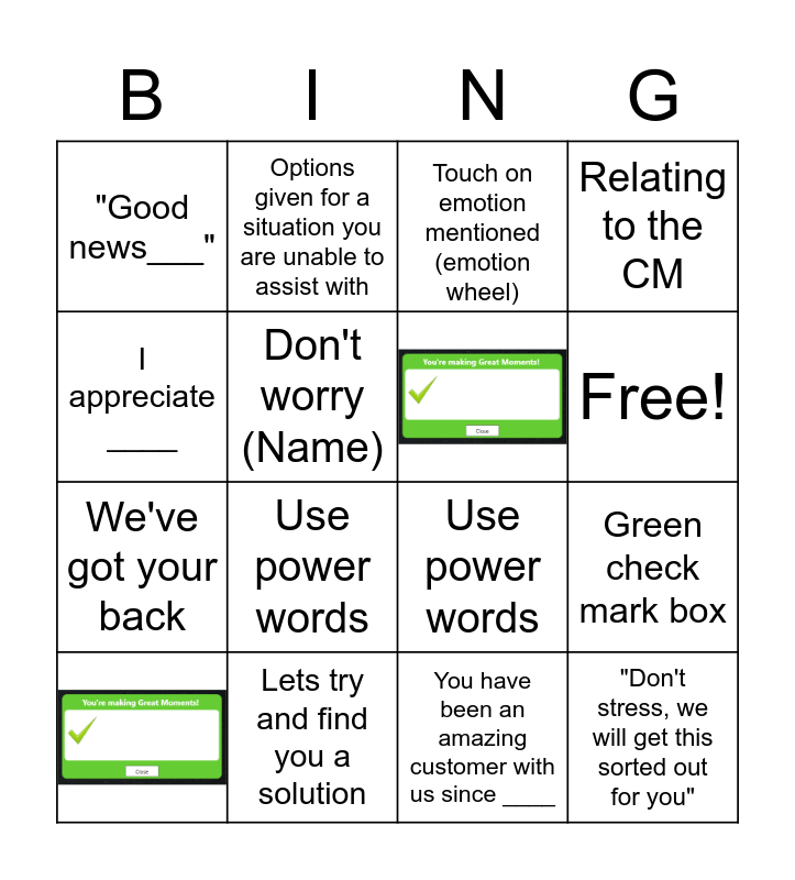 This bingo card has 2 images and 15 words: You have been an amazing customer with us since ____, Touch on emotion mentioned (emotion wheel), "Good news___", Use power words, Relating to the CM, Green check mark box, Free!, Don't worry (Name), Lets try and find you a solution, Use power words, I appreciate ____, Options given for a situation you are unable to assist with, We've got your back, Congratulations on ____ and "Don't stress, we will get this sorted out for you".