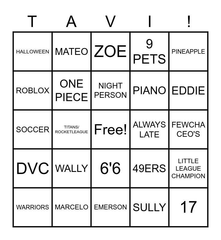 This bingo card has a free space and 34 words: 10/29, SULLY, SAN PABLO, TARA, DVC, ONE PIECE, PINEAPPLE, WARRIORS, MATEO, COCO, NIGHT PERSON, ZOE, WOODY, MESSI, ALWAYS LATE, EDDIE, MARCELO, SOCCER, WALLY, 49ERS, 6'6, REGULAR SHOW, HALLOWEEN, FEWCHA CEO'S, EMERSON, 17, 9 PETS, BASKETBALL, PIANO, ROBLOX, JUNE 3, TITANS/ ROCKETLEAGUE, LITTLE LEAGUE CHAMPION and MARY FARMAR.