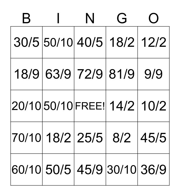 This bingo card has a free space and 24 words: 18/2, 50/5, 72/9, 60/10, 12/2, 30/5, 18/9, 50/10, 14/2, 25/5, 81/9, 20/10, 8/2, 45/5, 63/9, 30/10, 10/2, 40/5, 9/9, 50/10, 36/9, 70/10, 18/2 and 45/9.