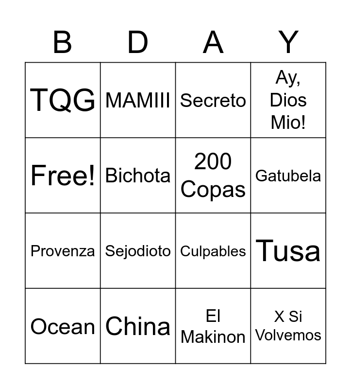 This bingo card has 16 words: China, Tusa, Secreto, TQG, Provenza, MAMIII, Culpables, El Makinon, Free!, Bichota, Ocean, Ay, Dios Mio!, Sejodioto, Gatubela, 200 Copas and X Si Volvemos.
