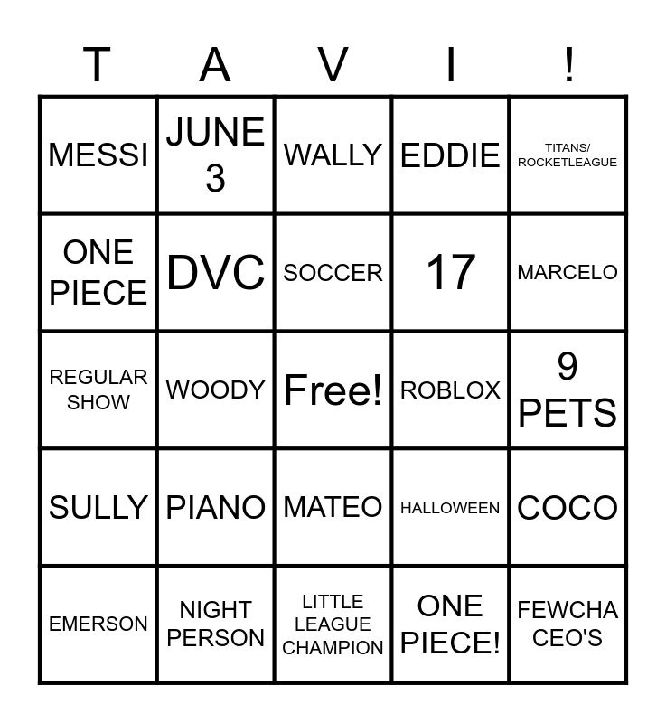 This bingo card has a free space and 34 words: WARRIORS, ONE PIECE!, 6'6, MARY FARMAR, SULLY, DVC, TITANS/ ROCKETLEAGUE, EMERSON, JUNE 3, 49ERS, SOCCER, WALLY, 10/29, ALWAYS LATE!, ROBLOX, MARCELO, NIGHT PERSON, REGULAR SHOW, PIANO, HALLOWEEN, MATEO, ZOE, MESSI, 9 PETS, LITTLE LEAGUE CHAMPION, FEWCHA CEO'S, EDDIE, PINEAPPLE, 17, ONE PIECE, TARA, WOODY, COCO and SAN PABLO.