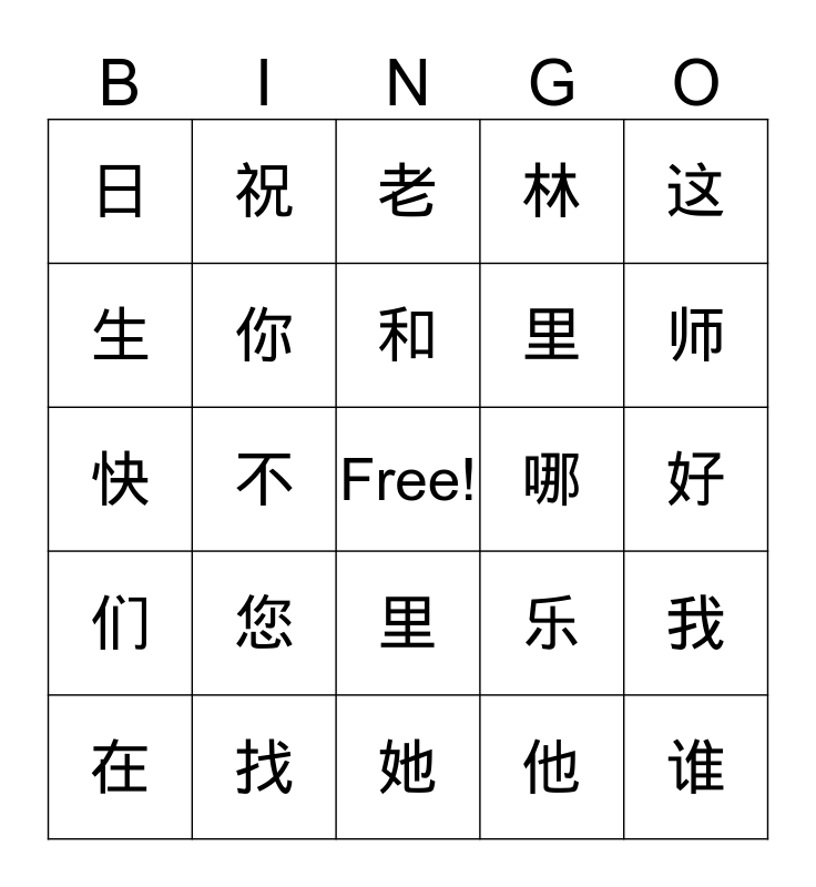 This bingo card has a free space and 24 words: 您, 找, 和, 在, 这, 日, 生, 祝, 哪, 里, 里, 快, 乐, 我, 你, 他, 好, 老, 师, 不, 谁, 们, 林 and 她.