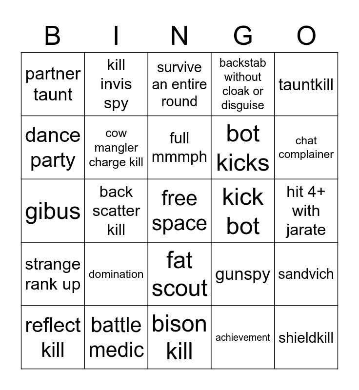 This bingo card has a free space and 24 words: domination, battle medic, full mmmph, reflect kill, tauntkill, partner taunt, dance party, kill invis spy, kick bot, fat scout, bot kicks, gibus, gunspy, sandvich, cow mangler charge kill, achievement, hit 4+ with jarate, survive an entire round, chat complainer, back scatter kill, shieldkill, strange rank up, backstab without cloak or disguise and bison kill.