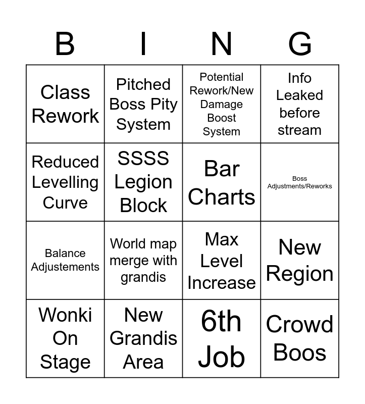 This bingo card has 16 words: New Grandis Area, New Region, Potential Rework/New Damage Boost System, Class Rework, Balance Adjustements, Pitched Boss Pity System, Max Level Increase, 6th Job, Reduced Levelling Curve, SSSS Legion Block, Wonki On Stage, Info Leaked before stream, World map merge with grandis, Boss Adjustments/Reworks, Bar Charts and Crowd Boos.