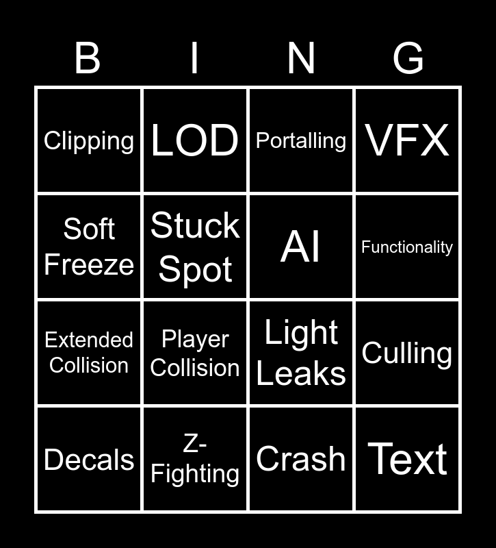 This bingo card has 16 words: Z-Fighting, Culling, Portalling, Clipping, Extended Collision, LOD, Light Leaks, Crash, Soft Freeze, Stuck Spot, Decals, VFX, Player Collision, Functionality, AI and Text.