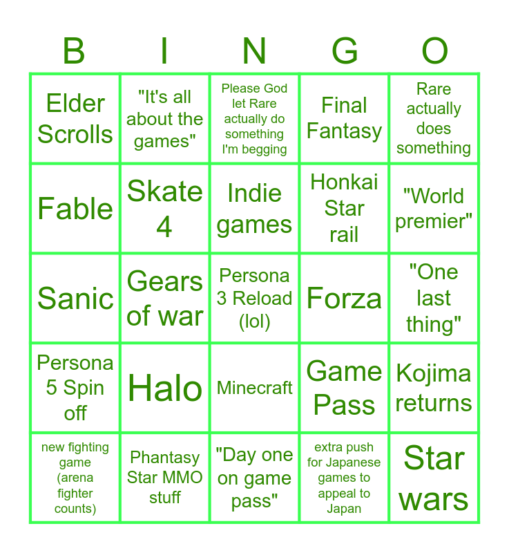 This bingo card has a free space and 24 words: Halo, Phantasy Star MMO stuff, Indie games, new fighting game (arena fighter counts), Rare actually does something, Elder Scrolls, Fable, "It's all about the games", Forza, Minecraft, Honkai Star rail, Sanic, Game Pass, Kojima returns, Skate 4, extra push for Japanese games to appeal to Japan, "One last thing", Please God let Rare actually do something I'm begging, "World premier", Gears of war, Star wars, Persona 5 Spin off, Final Fantasy and "Day one on game pass".