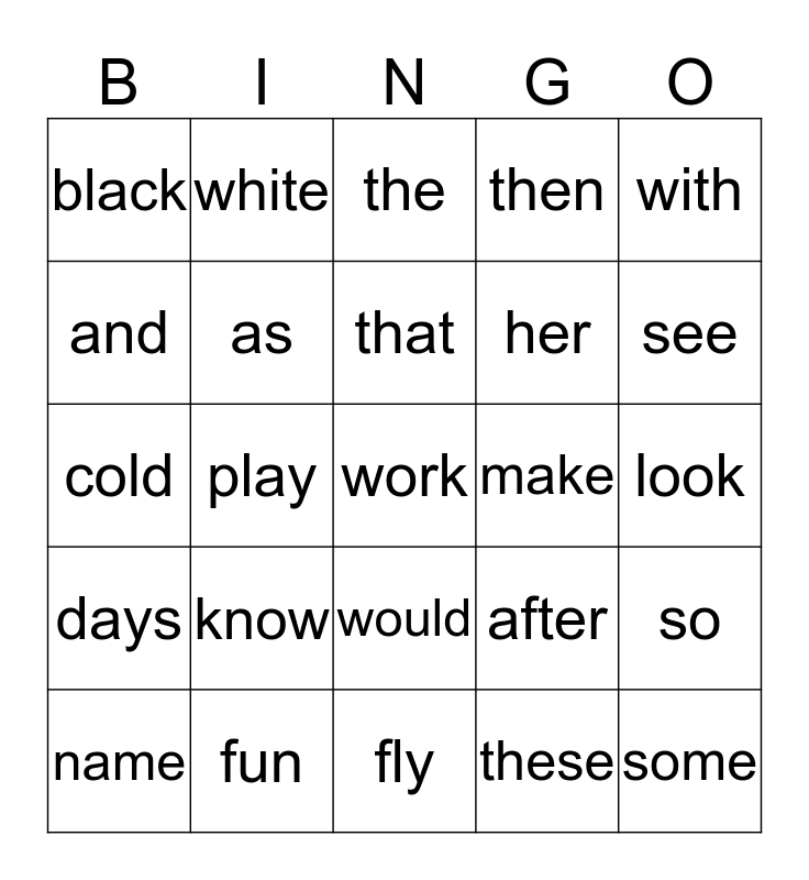 This bingo card has 25 words: know, fly, that, name, with, black, and, white, make, would, her, cold, after, so, as, some, look, the, see, play, work, fun, days, then and these.