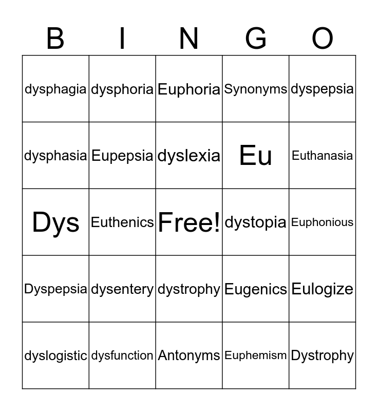 This bingo card has a free space and 24 words: dysentery, dysfunction, dyslexia, dyslogistic, dyspepsia, dysphagia, dysphasia, dysphoria, dystopia, dystrophy, Eu, Dys, Eugenics, Eulogize, Eupepsia, Euphemism, Euphonious, Euphoria, Euthanasia, Euthenics, Dystrophy, Dyspepsia, Synonyms and Antonyms.