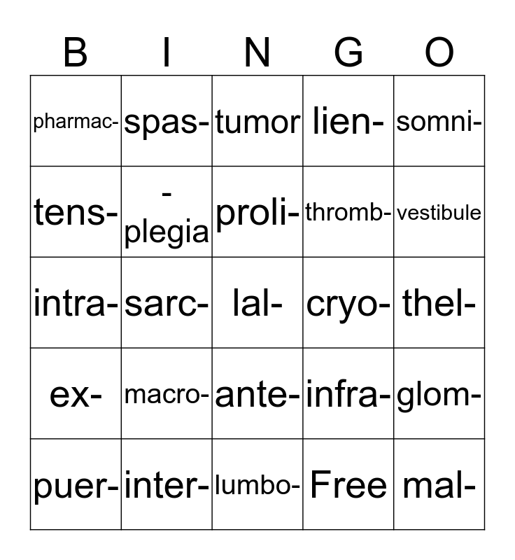 This bingo card has a free space and 25 words: macro-, lumbo-, proli-, puer-, somni-, pharmac-, tens-, spas-, cryo-, ante-, thromb-, intra-, infra-, glom-, -plegia, ab-, thel-, tumor, vestibule, sarc-, mal-, inter-, ex-, lien- and Free.