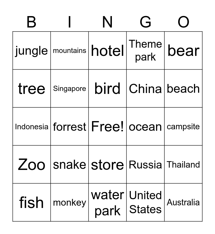 This bingo card has a free space and 24 words: snake, monkey, bird, fish, bear, jungle, tree, mountains, ocean, store, China, Indonesia, Russia, Thailand, Singapore, United States, campsite, hotel, beach, forrest, Australia, Zoo, Theme park and water park.