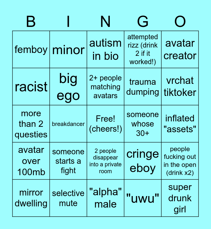 This bingo card has a free space and 24 words: someone starts a fight, selective mute, 2+ people matching avatars, mirror dwelling, avatar creator, femboy, racist, minor, someone whose 30+, 2 people disappear into a private room, trauma dumping, more than 2 questies, cringe eboy, people fucking out in the open (drink x2), big ego, "uwu", inflated "assets", autism in bio, vrchat tiktoker, breakdancer, super drunk girl, avatar over 100mb, attempted rizz (drink 2 if it worked!) and "alpha" male.