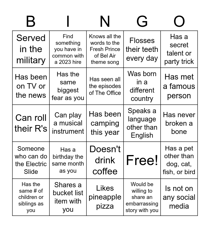This bingo card has 25 words: Has a birthday the same month as you, Likes pineapple pizza, Has seen all the episodes of The Office, Has the same # of children or siblings as you, Has a secret talent or party trick, Served in the military, Has been on TV or the news, Find something you have in common with a 2023 hire, Speaks a language other than English, Doesn't drink coffee, Was born in a different country, Can roll their R's, Free!, Has a pet other than dog, cat, fish, or bird, Has the same biggest fear as you, Is not on any social media, Has never broken a bone, Knows all the words to the Fresh Prince of Bel Air theme song, Has met a famous person, Can play a musical instrument, Has been camping this year, Shares a bucket list item with you, Someone who can do the Electric Slide, Flosses their teeth every day and Would be willing to share an embarrassing story with you.