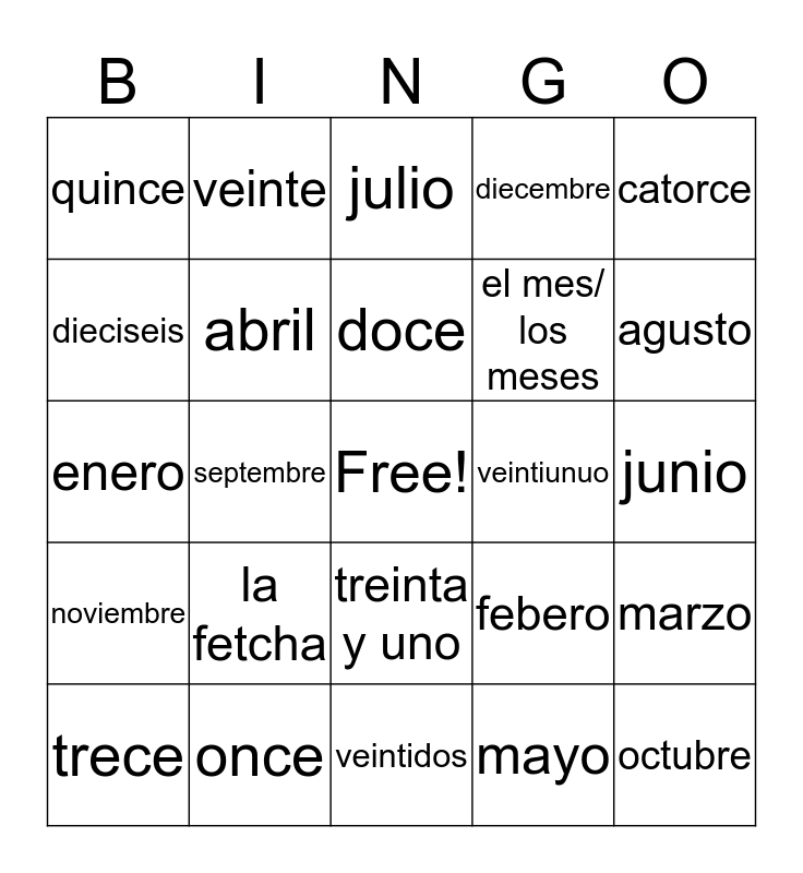This bingo card has a free space and 24 words: la fetcha, once, doce, trece, catorce, quince, dieciseis, veinte, veintiunuo, treinta y uno, el mes/ los meses, enero, febero, marzo, abril, mayo, junio, julio, agusto, septembre, octubre, noviembre, diecembre and veintidos.