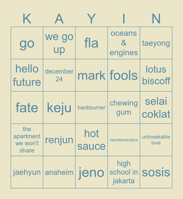 This bingo card has 25 words: renjun, jeno, mark, jaehyun, taeyong, go, hello future, we go up, chewing gum, hot sauce, fools, fate, nandemonaiya, unbreakable love, december 24, sosis, selai coklat, fla, lotus biscoff, keju, backburner, anaheim, the apartment we won't share, oceans & engines and high school in jakarta.