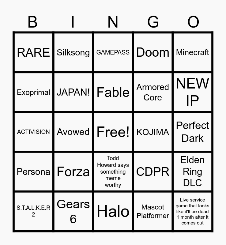 This bingo card has a free space and 24 words: Forza, Gears 6, Fable, S.T.A.L.K.E.R 2, Minecraft, RARE, Exoprimal, Silksong, KOJIMA, Todd Howard says something meme worthy, Armored Core, ACTIVISION, CDPR, Elden Ring DLC, JAPAN!, Mascot Platformer, Perfect Dark, GAMEPASS, NEW IP, Avowed, Live service game that looks like it'll be dead 1 month after it comes out, Persona, Doom and Halo.