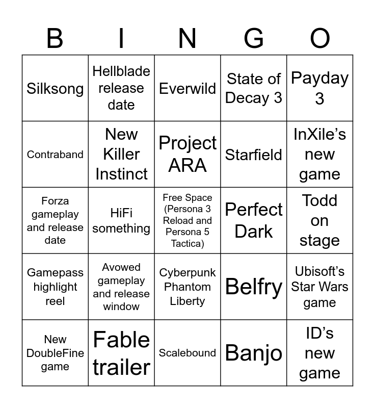 This bingo card has a free space and 24 words: Avowed gameplay and release window, Fable trailer, Project ARA, New DoubleFine game, Payday 3, Silksong, Contraband, Hellblade release date, Perfect Dark, Cyberpunk Phantom Liberty, Starfield, Forza gameplay and release date, Belfry, Ubisoft’s Star Wars game, New Killer Instinct, Banjo, Todd on stage, Everwild, InXile’s new game, HiFi something, ID’s new game, Gamepass highlight reel, State of Decay 3 and Scalebound.
