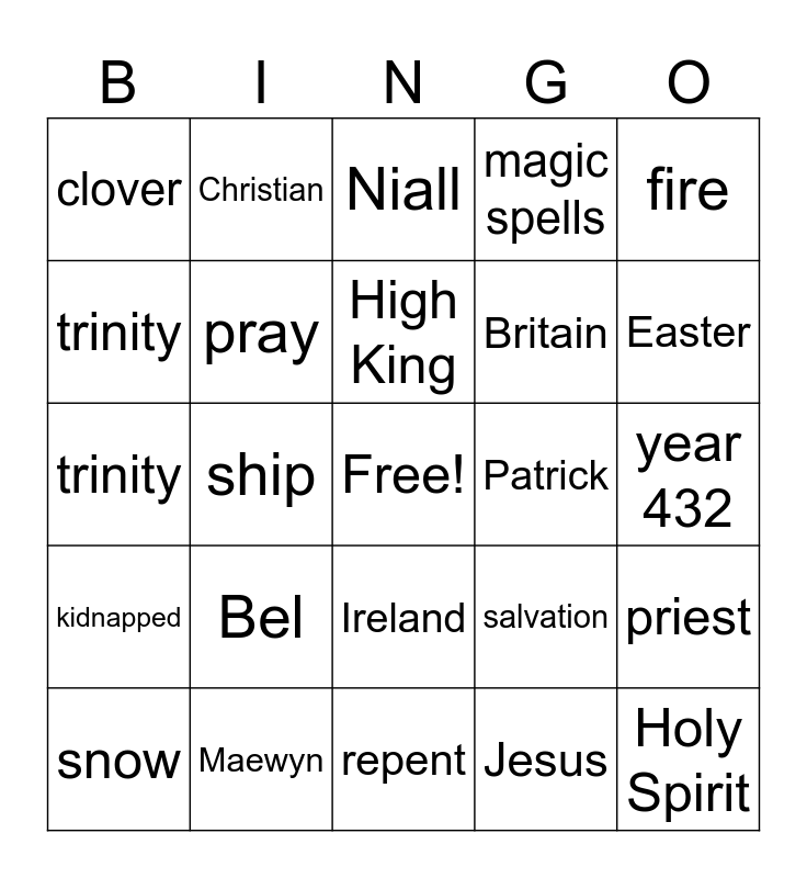 This bingo card has a free space and 24 words: Bel, Maewyn, High King, snow, fire, clover, trinity, Christian, Patrick, Ireland, Britain, trinity, salvation, priest, pray, Jesus, year 432, Niall, Easter, ship, Holy Spirit, kidnapped, magic spells and repent.