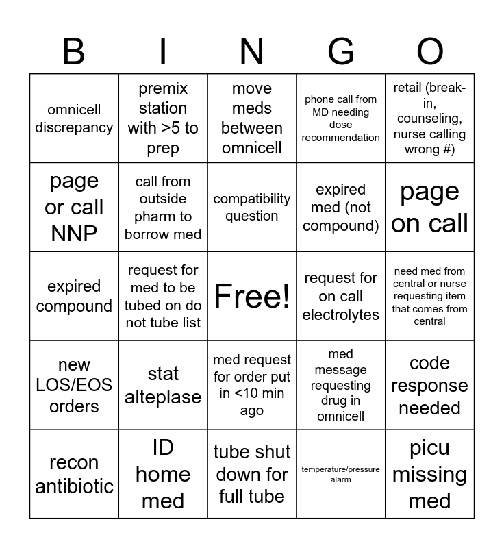 This bingo card has a free space and 42 words: weird/inappropriate item in return bin, compatibility question, TPN issue, stat alteplase, temperature/pressure alarm, code response needed, picu missing med, nurse has <1 hour on a drip, move meds between omnicell, med request for order put in <10 min ago, need med from central or nurse requesting item that comes from central, page on call, request for med to be tubed on do not tube list, retail (break-in, counseling, nurse calling wrong #), call to borrow a med, med message requesting drug in omnicell, need new tackle box, expired compound, smog compound, premix station with >5 to prep, page or call NNP, rec from a consult service, med sent secure returns in tube, omnicell discrepancy, med not scanning (doseedge or nurse call), trauma B/stab code/OB c-section, expired med (not compound), new DKA needs bags, pharm-is ticket, doseedge bypass, brand new TPN, new LOS/EOS orders, call from outside pharm to borrow med, tube shut down for full tube, request for vfc vaccine, recon antibiotic, ID home med, request for on call electrolytes, omnicell issue, med message requesting med scanned into med bin, phone call from MD needing dose recommendation and critical dose warning override.
