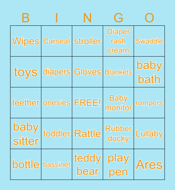This bingo card has a free space and 29 words: bottle, bibs, onesies, baby shower, Wipes, stroller, diapers, toddler, Baby monitor, bassinet, rompers, Ares, teddy bear, play pen, baby bath, bedding, Rattle, baby sitter, Swaddle, teether, Rubber ducky, nursery, Blankets, toys, Diaper rash cream, Carseat, Lullaby, Gloves and Pacifier.